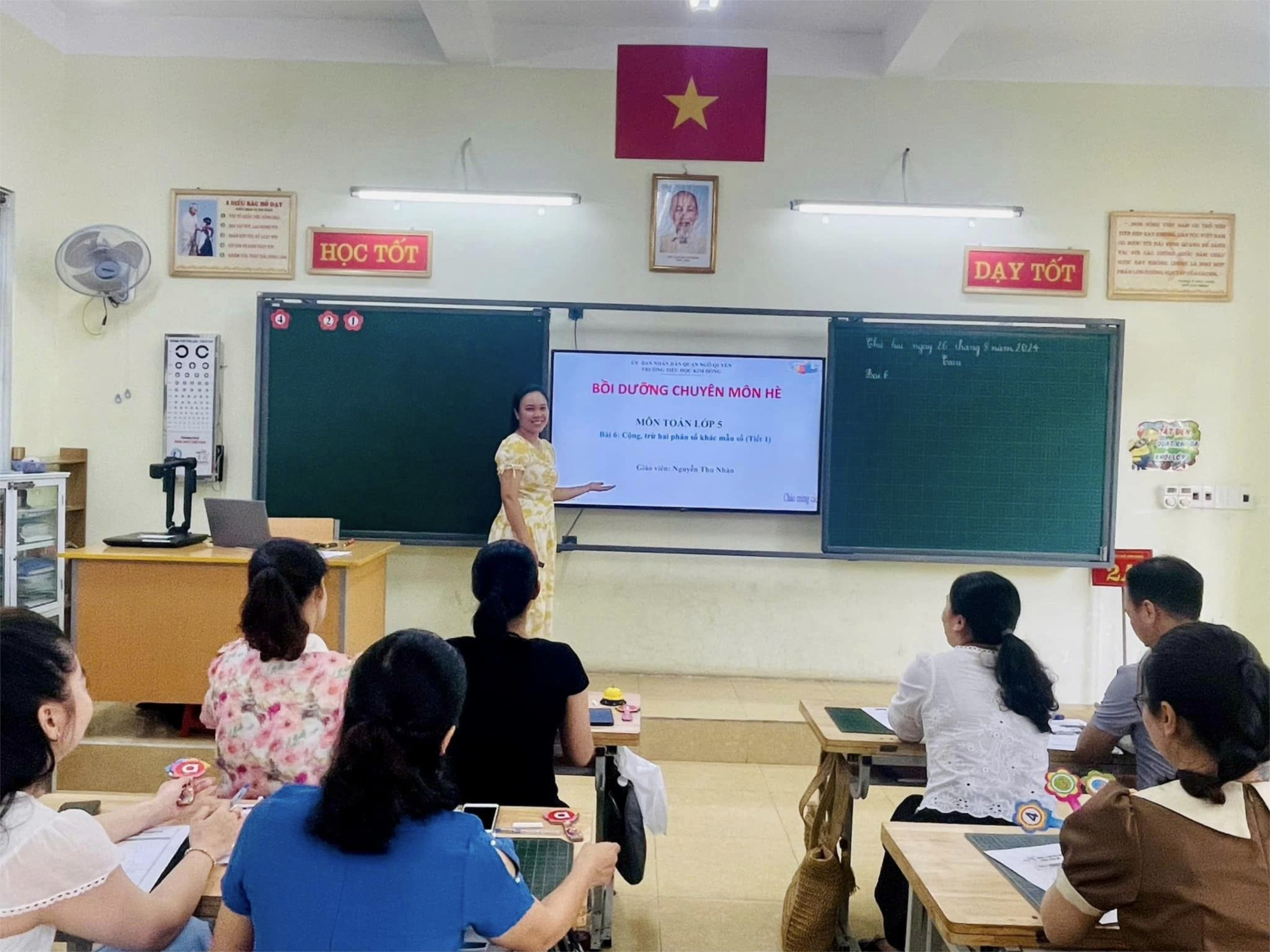 Để chuẩn bị tốt cho năm học 2024 – 2025 nâng cao chất lượng giảng dạy chương trình, kế hoạch dạy học sách giáo khoa lớp 5 đáp ứng chương trình giáo dục phổ thông 2018 đồng thời giúp các giáo viên học hỏi, trao đổi kinh nghiệm về phương pháp, hình thức dạy học các môn học của bộ sách giáo khoa “ Kết nối tri thức với cuộc sống” nhằm cụ thể hóa các nội dung chương trình tập huấn Hè 2024. Ngoài những tiết dạy của Quận Ngô Quyền, Trường Tiểu học Kim Đồng tiếp tục lên lớp môn Khoa học với bài “ Hỗn hợp và dung dịch” do cô giáo Đoàn Thị Duyên thực hiện; môn Toán với bài “ Cộng, trừ hai phân số khác mẫu số” cô giáo Nguyễn Thu Nhàn thực hiện. Tham dự có các đồng chí trong ban giám hiệu cùng toàn thể giáo viên các khối tổ trong trường. Với sự chuẩn bị tốt về giáo án điện tử, đồ dùng dạy học, sự phối hợp các phương pháp dạy học tích cực và hình thức dạy học đa dạng của các giáo viên được phân công, tiết học đã đem lại hiệu quả cao, các em được tương tác, trao đổi qua đó rèn cho các em kĩ năng giao tiếp, hoạt động nhóm, được phát huy trí lực, chủ động chiếm lĩnh tri thức mới.