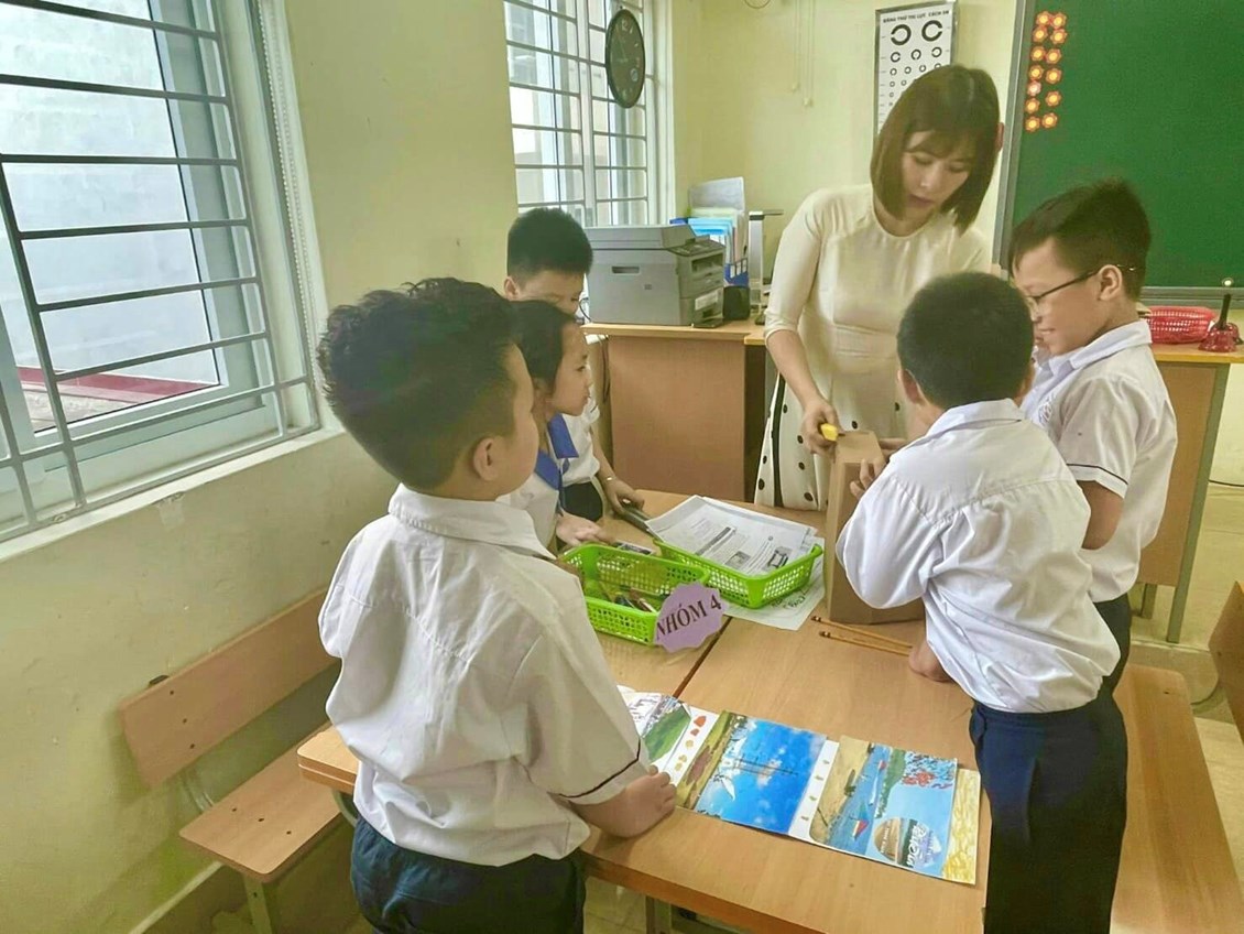 Bài học STEM (bài 5: Di tích lịch sử văn hóa và cảnh quan thiên nhiên) có môn học chủ đạo là Tự nhiên xã hội, môn tích hợp là Mĩ thuật và Toán, với mục tiêu giúp các em tự tay làm ra một máy chiếu phim để giới thiệu cho mọi người xung quanh về cảnh đẹp thiên nhiêm của đất nước Việt Nam, của thành phố Hải Phòng. Với sự giúp đỡ của cô giáo, các em học sinh đã cùng nhau tự khám phá nhiều kiến thức thú vị về về thiên nhiên qua máy chiếu phim mà các em tự thiết kế.