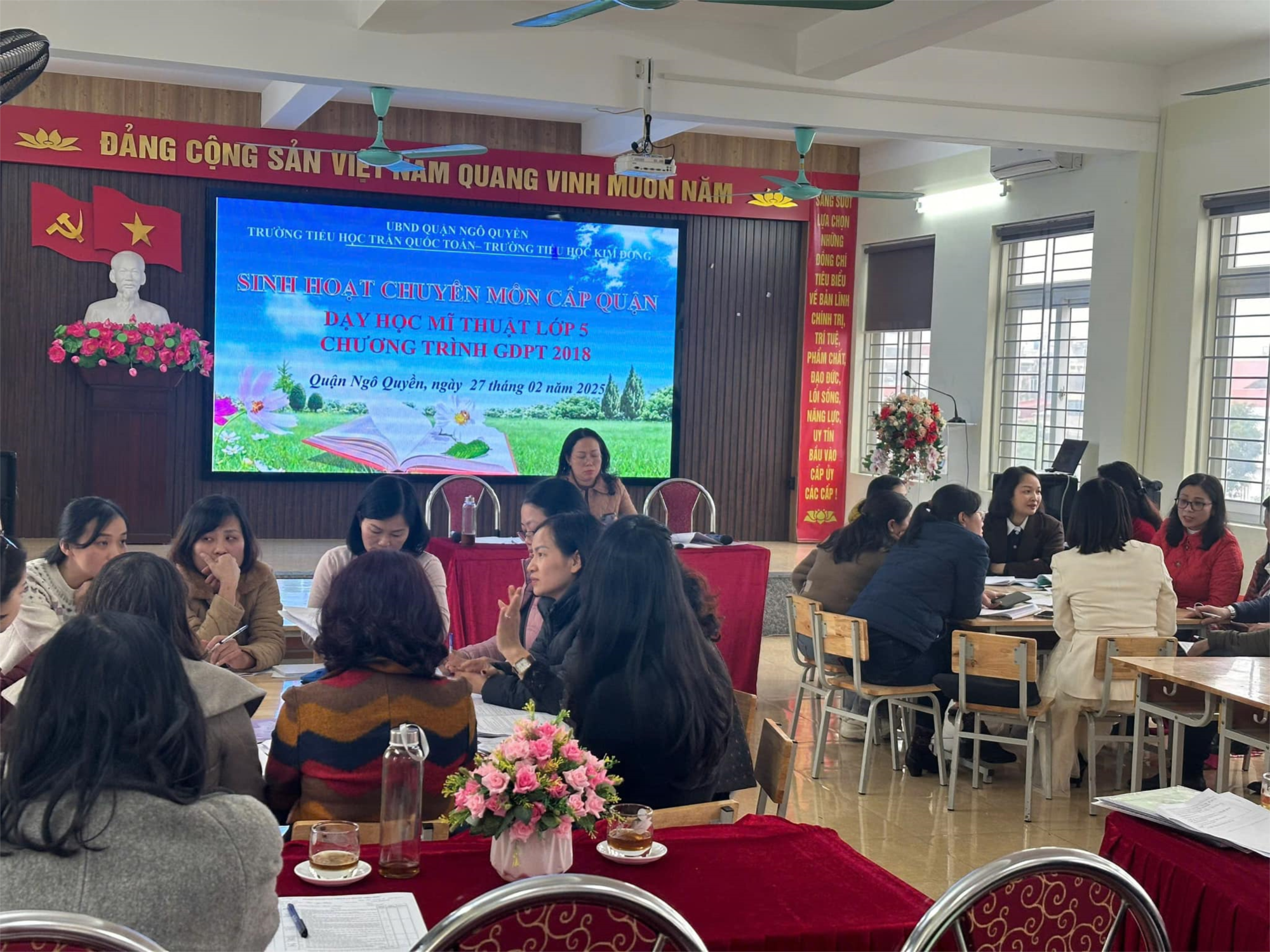 Chiều ngày 27 tháng 02 năm 2025, tại Trường Tiểu học Kim Đồng đã tổ chức buổi sinh hoạt chuyên môn cấp Quận môn Mỹ thuật “Thực hiện chương trình GDPT 2018 lớp 5” đối với bộ sách Cánh Diều. Tham dự buổi sinh hoạt chuyên môn có các đồng chí lãnh đạo và chuyên viên phụ trách cấp Tiểu học của Phòng GD&ĐT Quận Ngô Quyền, các đồng chí Hiệu trưởng của 02 trường; Phó Hiệu trưởng và các đ/c giáo viên giảng dạy môn Mỹ thuật các trường Tiểu học Quận Ngô Quyền.
