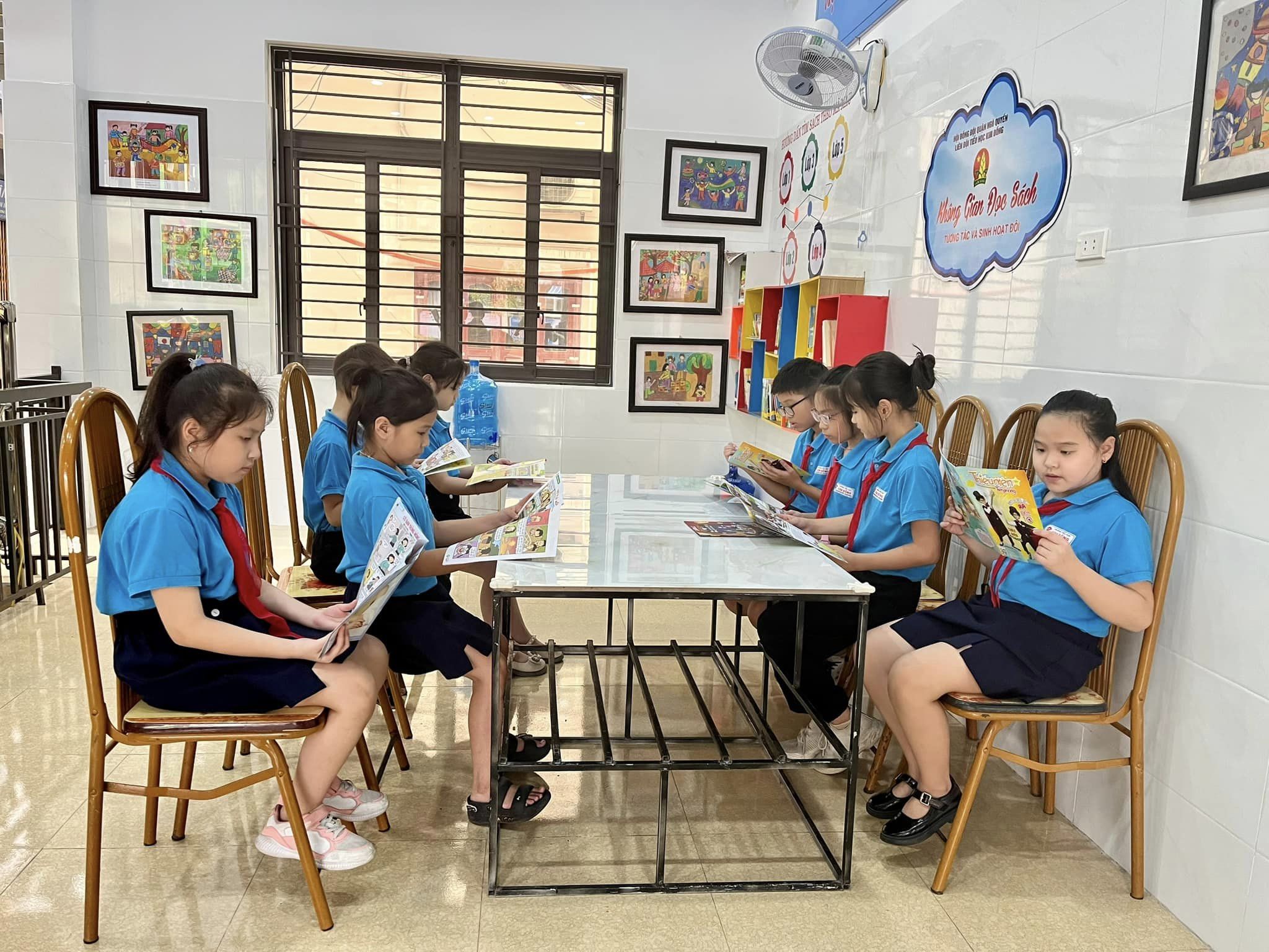 Hưởng ứng phong trào " Đọc và làm theo báo Đội", ngoài các tiết đọc sách thư viện, các bạn còn tranh thủ đọc báo vào các giờ ra chơi hay giờ tan học mỗi ngày và chia sẻ cho nhau nghe những câu chuyện thú vị hay những tấm gương thiếu nhi học tốt tiêu biểu.