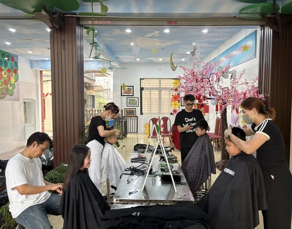 Giữa không gian sân trường thân quen, những chiếc ghế cắt tóc giản dị được sắp xếp ngay ngắn, từng lượt học sinh háo hức chờ đến lượt mình. Dưới đôi tay khéo léo, tận tâm của những bàn tay yêu thương – các anh chị tình nguyện viên, mái tóc của các em dần trở nên gọn gàng, sạch đẹp. Không chỉ là sự thay đổi về diện mạo, đó còn là sự chăm sóc ân cần, là tình cảm sẻ chia được gửi gắm trong từng cử chỉ giản dị.
