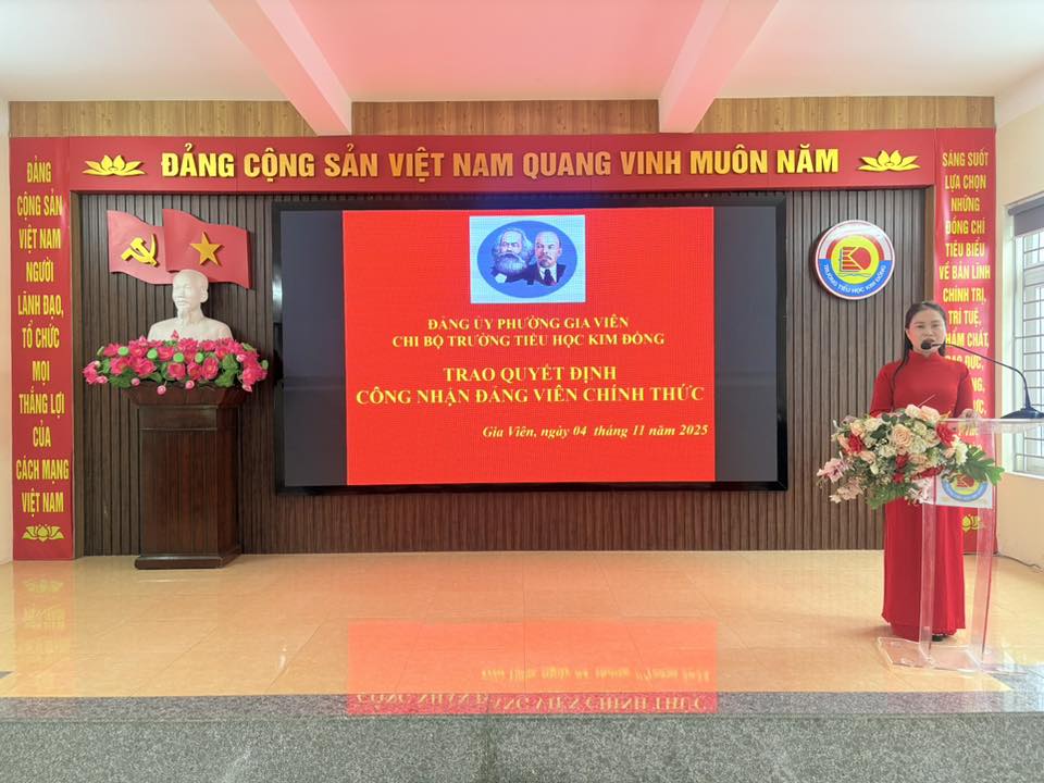 Sáng ngày 04 tháng 11 năm 2025, Chi bộ Trường Tiểu học Kim Đồng, phường Gia Viên đã long trọng tổ chức Lễ công nhận đảng viên chính thức cho đồng chí Phạm Thị Thu Hằng – giáo viên của nhà trường.