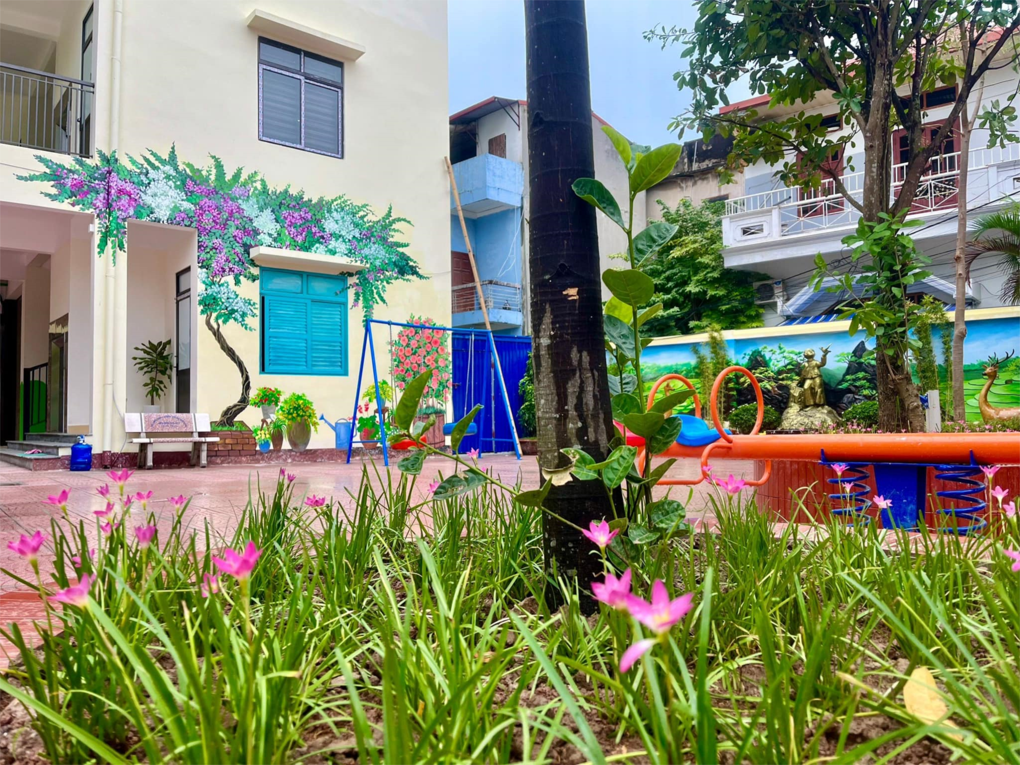 Ấn tượng nhất với chúng em là khoảng sân tuy không rộng nhưng được sự quan tâm và yêu thương của các thầy cô, chúng em cũng có một khu vui chơi với bập bênh, xích đu, cầu trượt, leo thang, bóng rổ…Hay một khu đọc sách ngay cạnh cổng trường để chúng em vừa đọc sách vừa chờ đợi cha mẹ đón những buổi tan trường.
