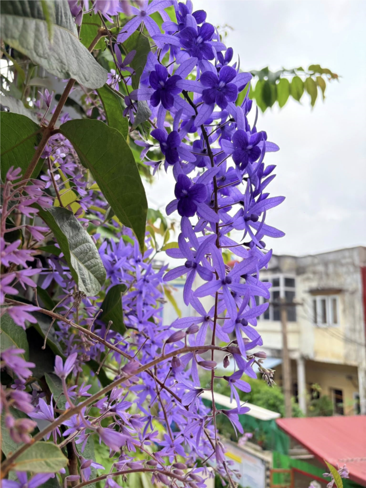 Sắc tím giàn hoa mai Thái trước gió thật đẹp — một vẻ đẹp vừa dịu dàng, vừa đầy sức sống. Những chùm hoa mỏng manh rung rinh trong làn gió nhẹ, như đang thì thầm những bản nhạc dịu dàng của thời khắc giao mùa từ xuân sang hạ.