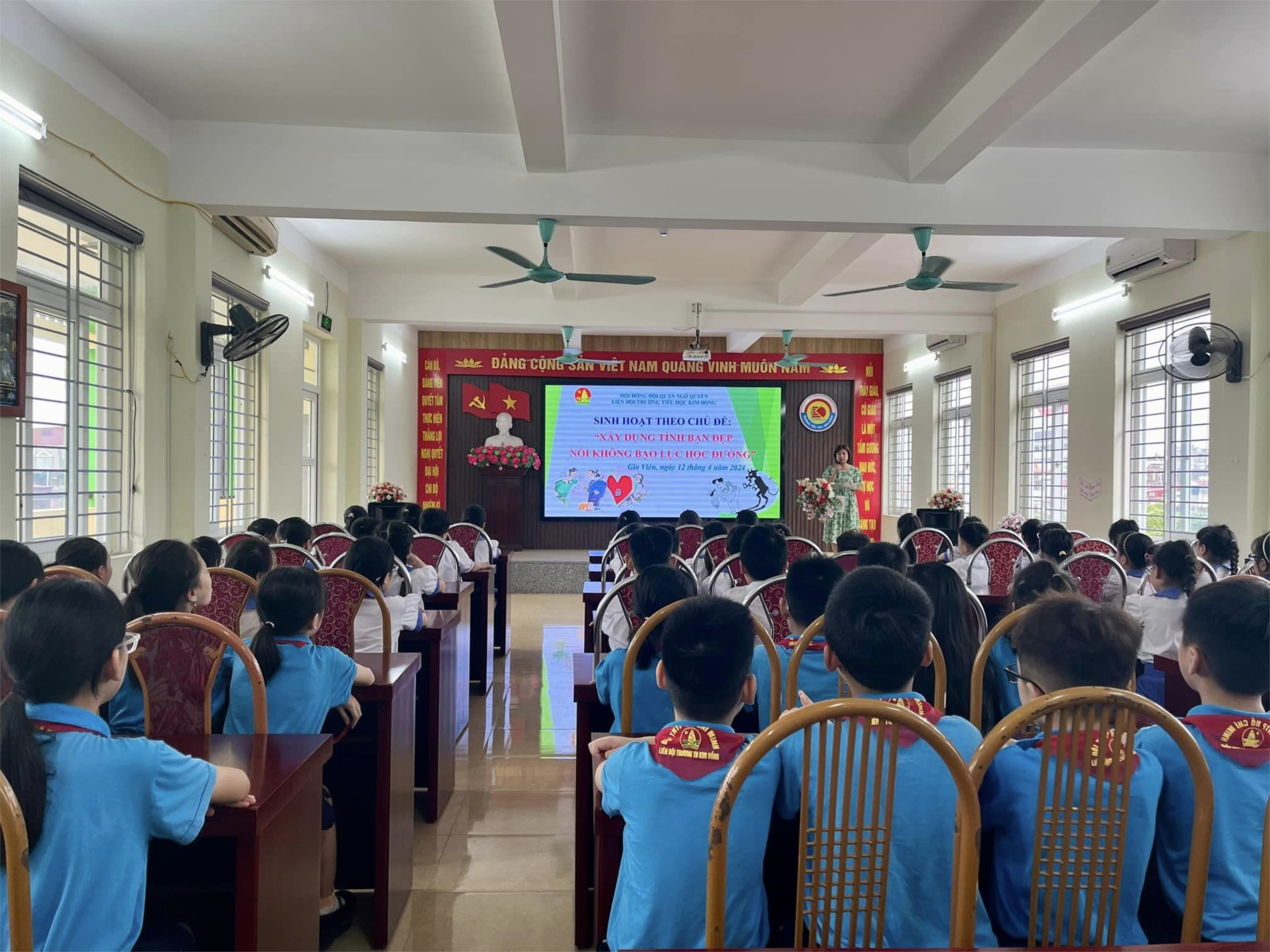 Thực hiện Chương trình công tác Đội và phong trào thiếu nhi năm học 2023 - 2024, chiều ngày 12/4 Liên đội trường TH Kim Đồng tổ chức sinh hoạt theo chủ đề: “Xây dựng tình bạn đẹp - Nói không bạo lực học đường” nhằm trang bị cho các em học sinh kiến thức cần thiết để tự chăm sóc và bảo vệ bản thân trước những nguy cơ tiềm ẩn bởi bạo lực học đường.