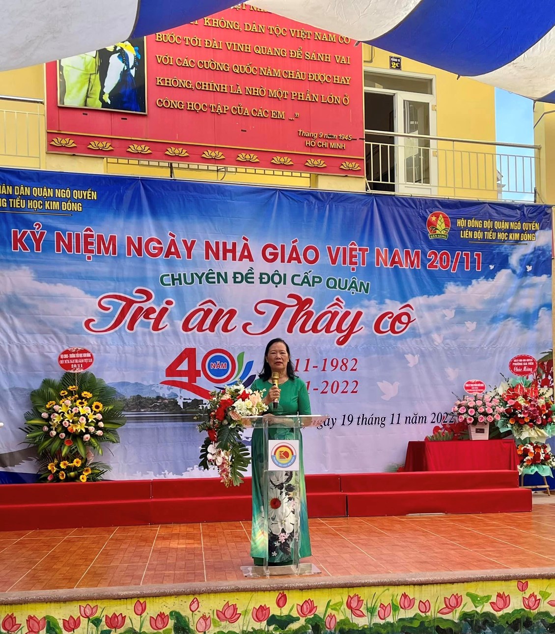 Tại buổi lễ kỉ niệm, thay mặt cho lãnh đạo nhà trường, cô giáo Lâm Thị Bích Liên – Đảng ủy viên – Bí thư chi bộ - Hiệu trưởng nhà trường đã ôn lại truyền thống 40 năm ngày Nhà giáo Việt Nam (20/11/1982 – 20/11/2022). Buổi lễ cũng là dịp gửi tấm lòng tri ân đến các thế hệ Nhà giáo của trường Tiểu học Kim Đồng. Tại buổi lễ kỉ niệm, nhà trường cũng nhận được nhiều lẵng hoa tươi thắm, những lời chúc mừng của các cơ quan đoàn thể và các bậc phụ huynh trong nhà trường. Đồng thời, các em học sinh trường Tiều học Kim Đồng cũng có những bông hoa tươi thắm thể hiện truyền thống tôn sư trọng đạo, uống nước nhớ nguồn, bày tỏ lòng tri ân sâu sắc đối với quý thầy cô đã và đang giảng dạy tại trường Tiểu học Kim Đồng – những người đã đóng góp công sức trong sự nghiệp giáo dục, góp phần xây dựng nền móng cho trường Tiểu học Kim Đồng. Cũng nhân dịp này, nhà trường đã biểu dương thành tích của những cá nhân đã không ngừng nỗ lực, đóng góp công sức và trí tuệ cho sự phát triển của nhà trường nói riêng và sự nghiệp trồng người của toàn ngành giáo dục nói chung.